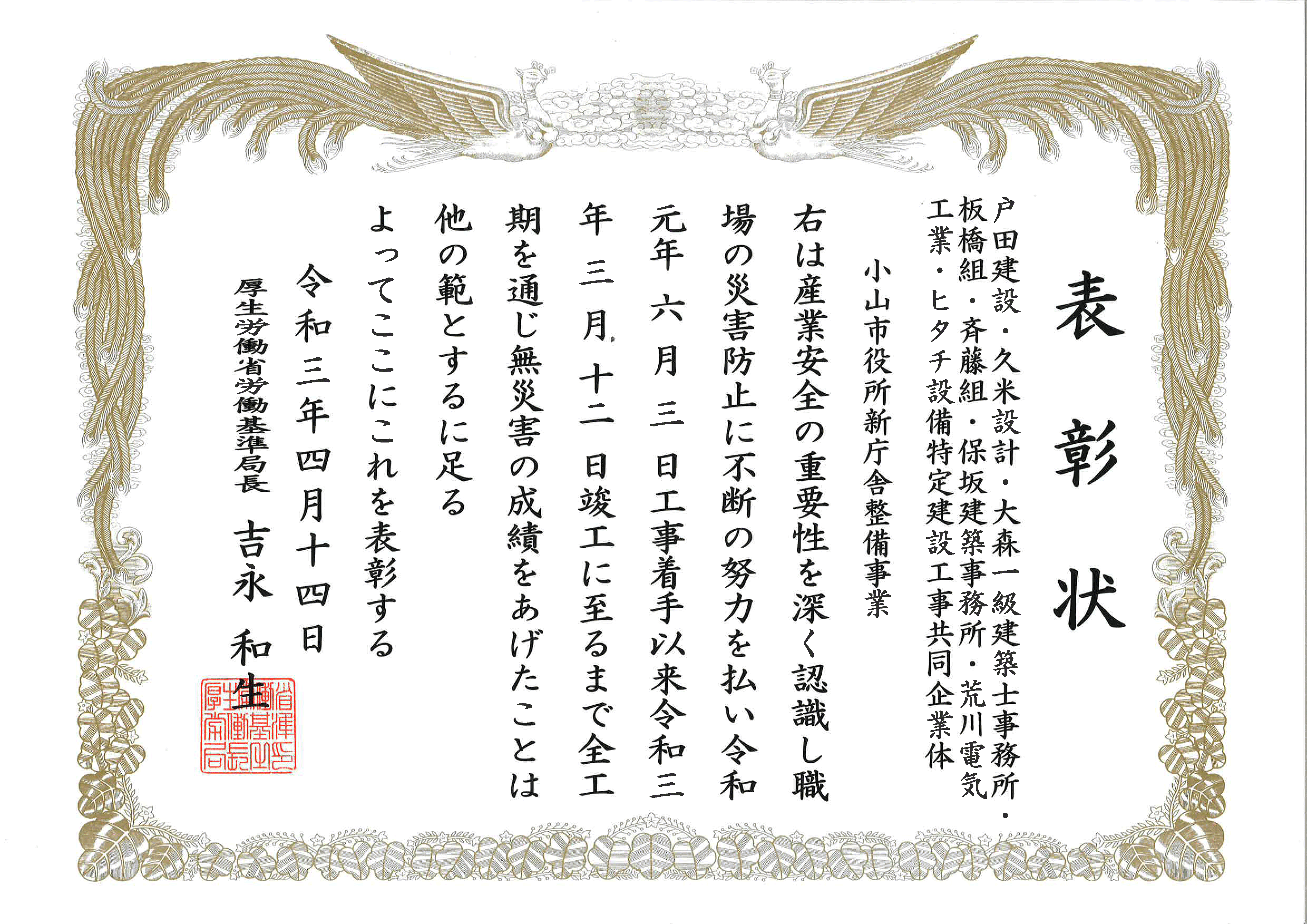 厚生労働省労働基準局より無災害表彰を受けました。【表彰状】